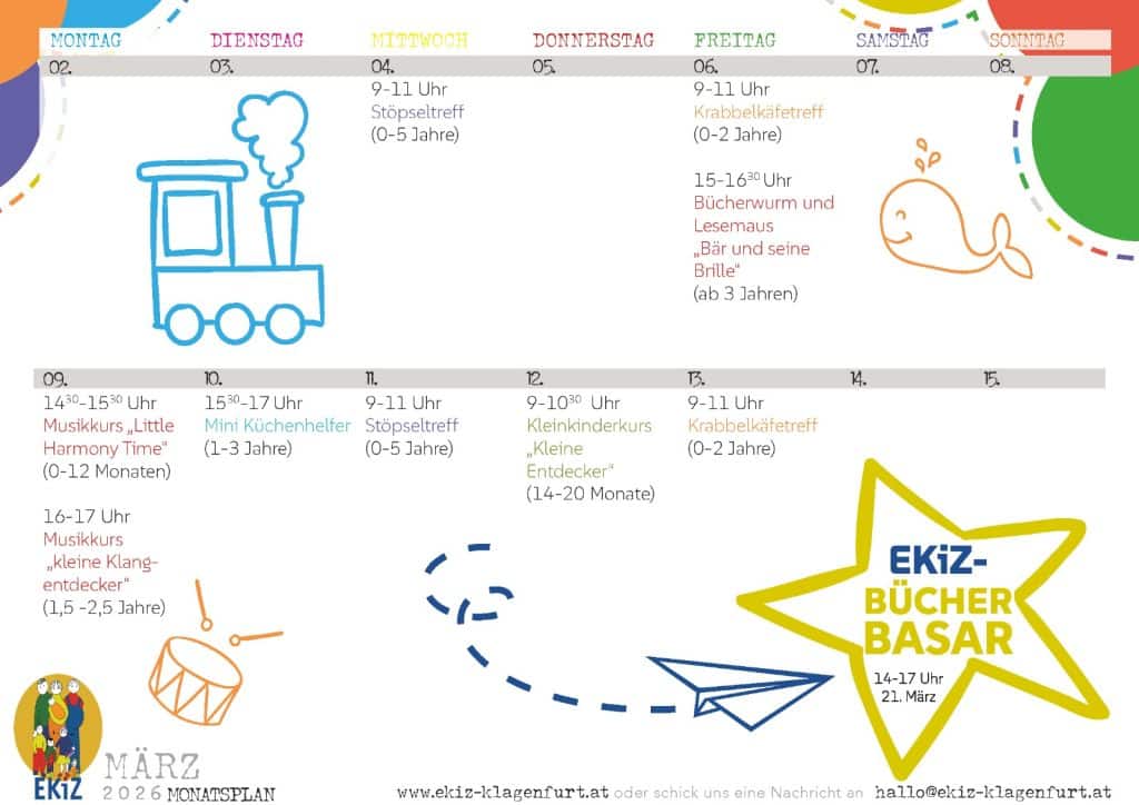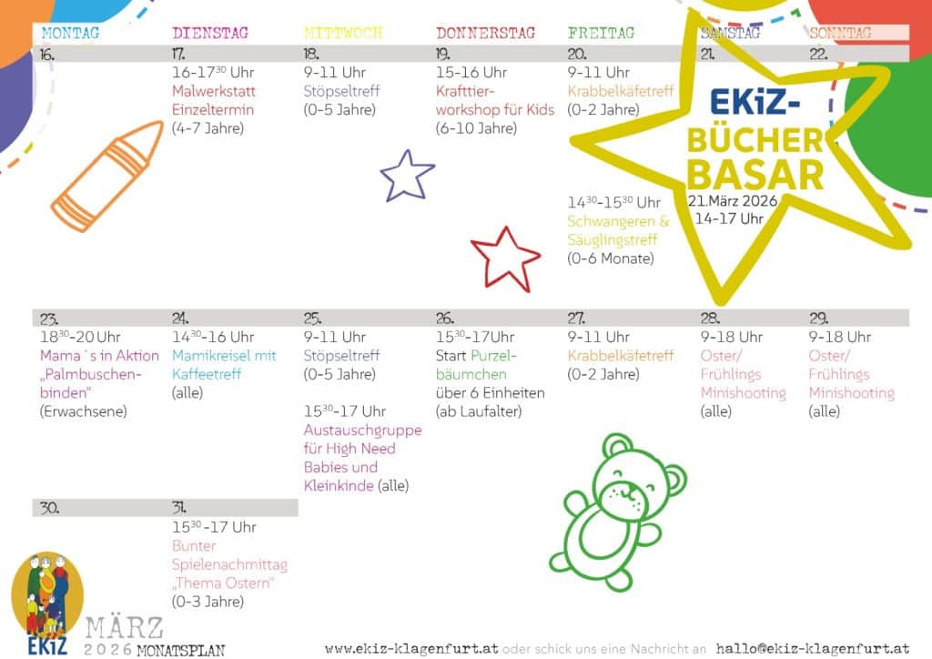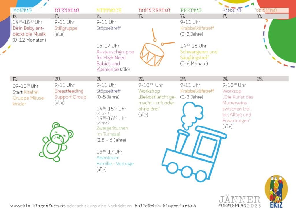 Bereits seit über 35 Jahren ist das Eltern-Kind Zentrum Klagenfurt für Familien ein Ort der Begegnung und des Austausches. Unser Angebot umfasst Kurse, Treffs und Workshops von der Schwangerschaft über die Babyzeit bis ins Kleinkind- und Vorschulalter.